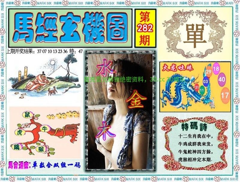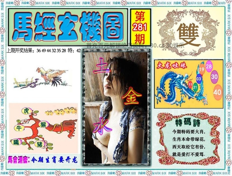 282期马经玄机 特碼詩:十二生肖我在中,牛鸡成群我来发,牛鬼蛇神四方躲,虎猴相冲定本期. 解肖:鼠虎鸡猴牛 |